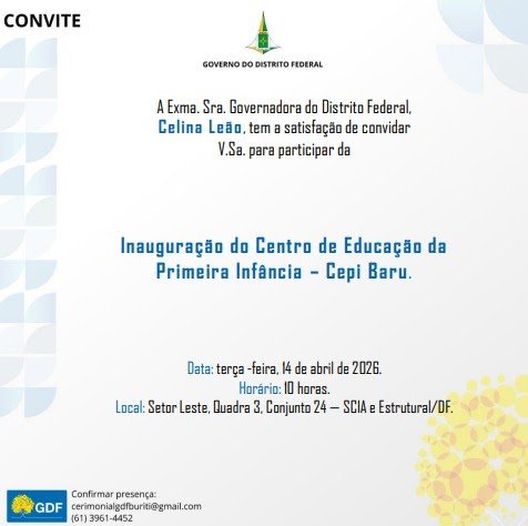 A entrega da obra representa também um investimento estratégico na base educacional, com impacto direto na qualidade de vida das famílias da Estrutural. Além de garantir acesso à educação, o novo centro permitirá que pais e responsáveis tenham mais tranquilidade para trabalhar, sabendo que seus filhos estão em um ambiente preparado e acolhedor.